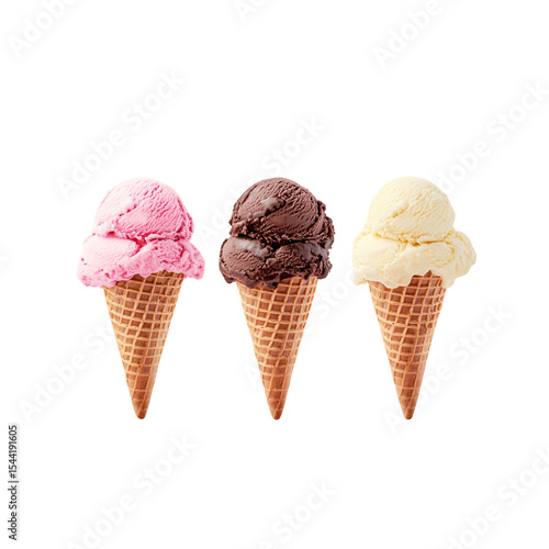Three ice cream cones showcasing different flavors against a clean white backdrop