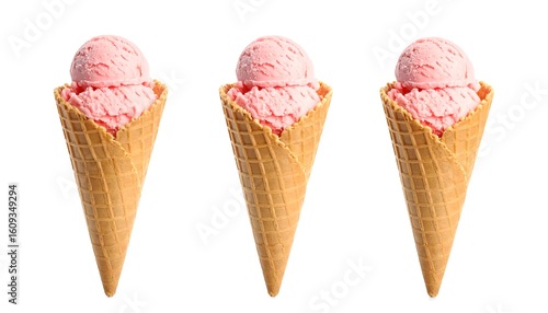 Three Ice Cream Cones with Strawberry Flavored Scoops