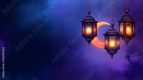 Three illuminated lanterns hang against a crescent moon and dark blue night sky.