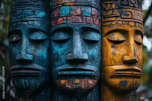 Three intricately carved wooden figures, featuring vibrant colors and distinct characteristics, embody cultural heritage in a lush garden setting during daytime Generative AI