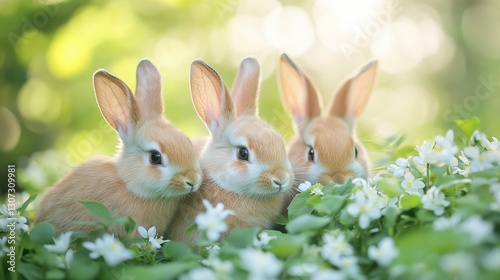 Three light brown rabbits frolic among white blooms, gazing right while ears tilt left, creating an enchanting snapshot of nature's harmony in a sunlit field