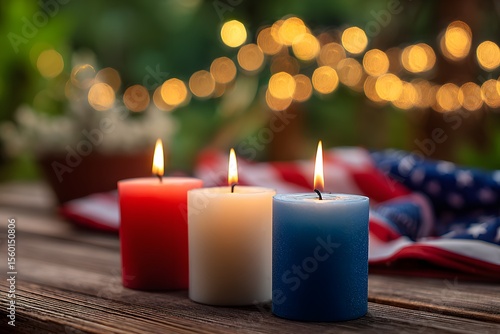 Three lit candles in red, white, and blue colors on a wooden table. A blurred background with string lights and an American flag draped nearby. Perfect for USA celebrations.