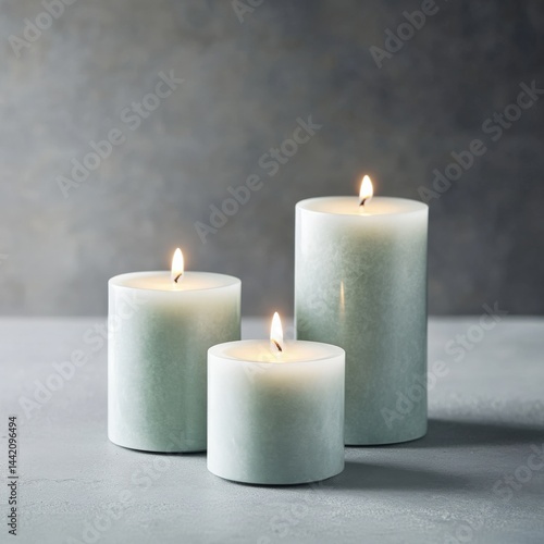 Three lit wax candles glow
