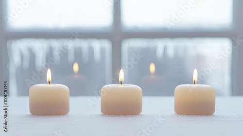 Three lit white candles on a snowy surface create a serene and calming atmosphere with a blurred background of soft light.