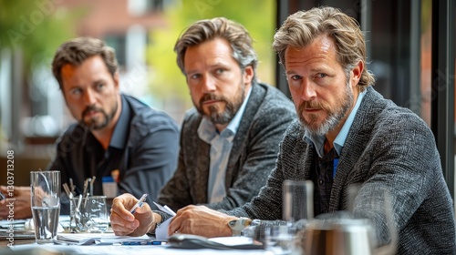 Three Men Sitting At A Table Looking Directly Ahead