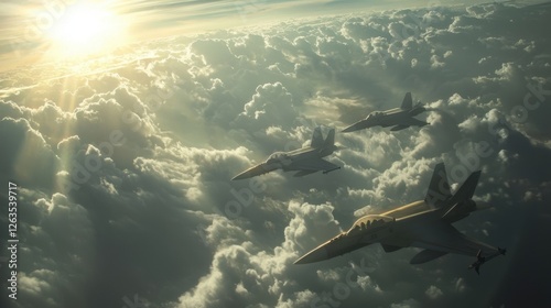 Three military fighter jets navigate through a breathtaking cloud formation as the sun sets on the horizon, creating a stunning display of aerial engineering and beauty