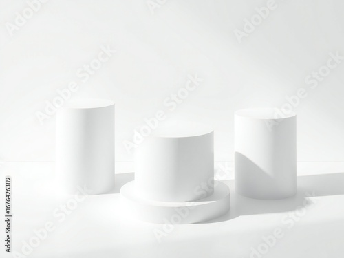Three minimalist white cylinders on a white background with soft shadows