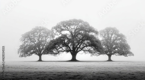 Three misty trees in a field