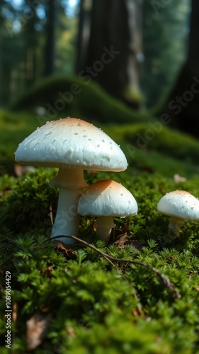 Three mushrooms sprout amidst lush moss on a forest floor during a summer afternoon