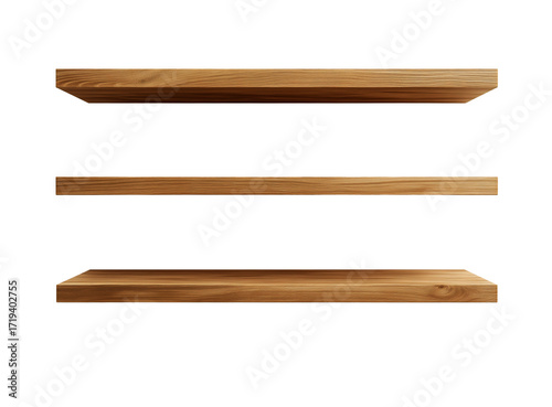 Three natural wooden modern floating shelves with wood grain texture on white or transparent background.