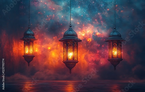 Three Ornate Lanterns Glowing with Warm Light Against a Mystical Starry Background