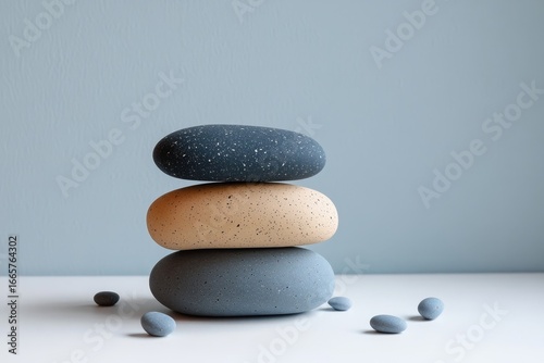 Three painted stones, varying in shades of beige and gray-blue, create a serene and balanced composition on a white surface against a muted backdrop.