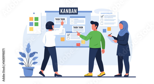 Three people collaborate on a Kanban board, organizing tasks and tracking progress in a bright, modern office setting.