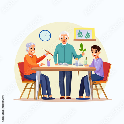 Three people, two seniors and a young man, engaged in a creative activity at a table.