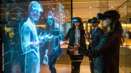 Three people wearing virtual reality headsets interact with an augmented reality interface.