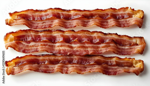 Three perfectly cooked crispy bacon strips arranged on a white background. The bacon has a deep reddish-brown color with streaks of golden fat running through it.