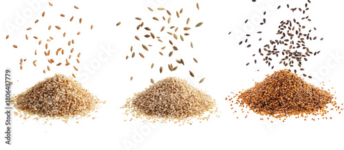 Three piles of sesame seeds caraway seeds and watermelon seeds on transparent background