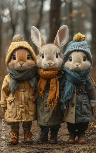 Three rabbits are standing in a forest, each wearing a scarf and a hat