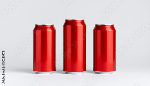 Three red aluminium cans. Beer or soda package. Drink and beverage concept. Mock-up.
