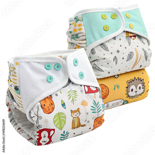 Three Reusable Cloth Diapers with Colorful Prints Isolated on Transparent Background