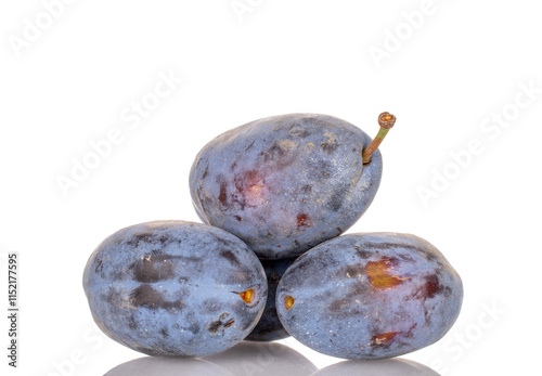 Three ripe black plums, macro, isolated on white background.