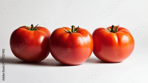 Three ripe red tomatoes arranged in a row on a clean white background, showcasing freshness