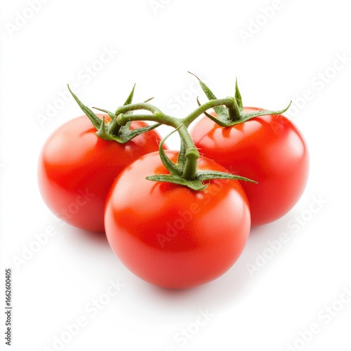 Three ripe, red tomatoes clustered together on stems, isolated against a pure white background