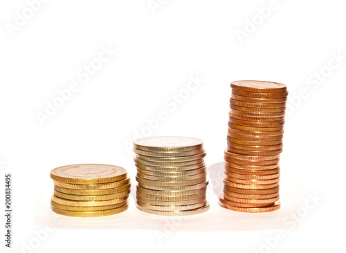 Three rows of coins, Gold, silver and copper color of coin in various sizes and valued on white background