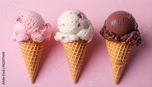 Three scoops of Neapolitan ice cream in waffle cone against vibrant pink background. Flavors include vanilla with strawberry pieces, strawberry, chocolate