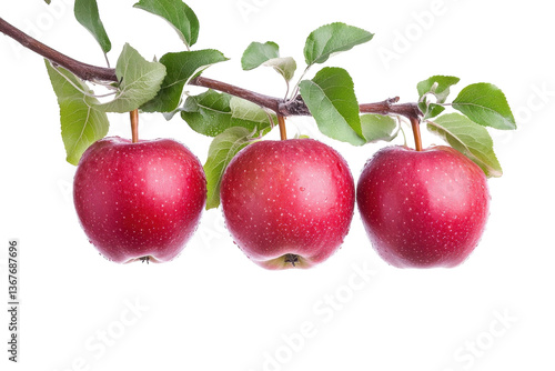 Three shiny red apples hanging from a branch surrounded by vibrant green leaves in natural light isolated on transparent background