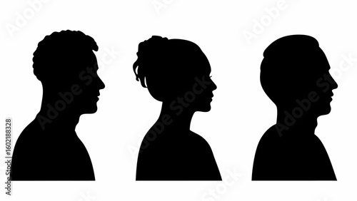 Three silhouette profiles of people with different hairstyles in black on a white background shown side by side