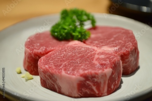 Three slices of premium Kobe beef, a Japanese Wagyu steak, are arranged on a white plate, ready for grilling. The marbling of the meat is a hallmark of Kobe beef, creating a tender and flavorful dinin