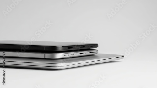 Three smartphones are arranged in a stack, featuring a black device on top and two silver ones below. Nearby, an open laptop completes the professional setup against a white background