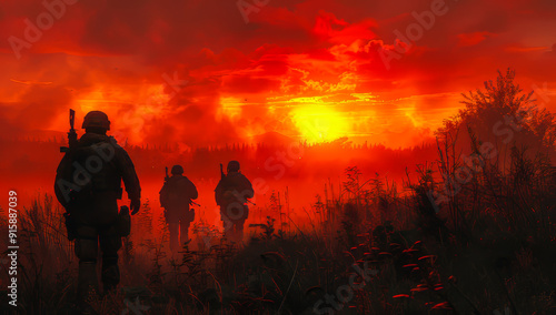 Three soldiers are walking through a field at sunset. The sky is orange and the sun is setting. The soldiers are carrying guns and appear to be on a mission.