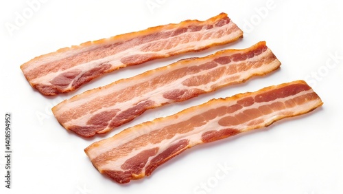 Three strips of cooked bacon with visible fat and meat on a plain white surface in a studio shot isolated on white background