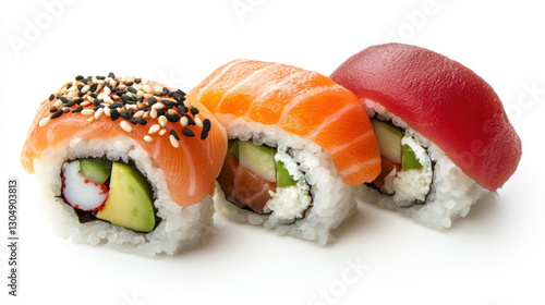 Three sushi rolls with salmon, tuna, and sesame seeds on white background
