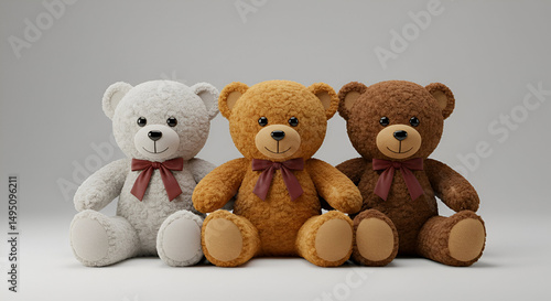 Three teddy bears in neutral tones of light gray, golden brown, and dark brown, sitting in a row against a plain light gray background.