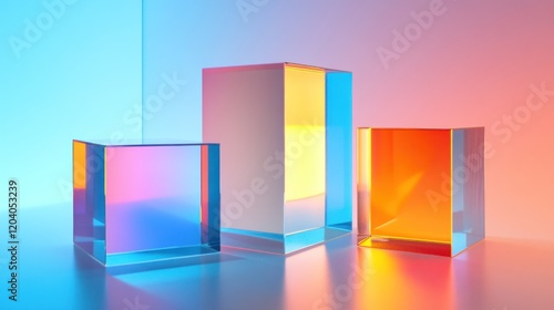 Three translucent cubes reflecting vibrant colors against a smooth background