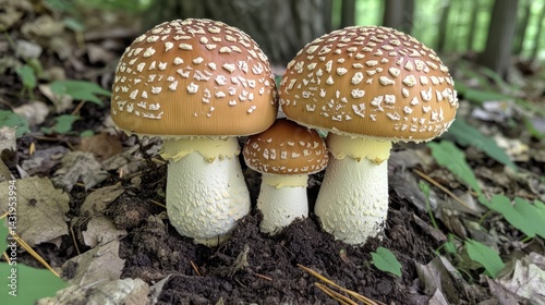 Three unique mushrooms emerge from the soil amid green leaves and forest vibes