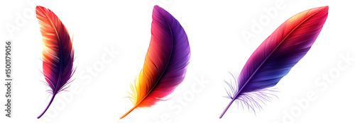 Three vibrant feathers isolated on transparent background showing a gradient of red, orange, purple and blue