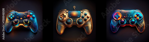 Three vibrant game controllers, glowing with color, showcase advanced gaming technology. Each controller displays unique design and color scheme.