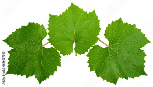 Three vibrant grape leaves display intricate patterns against a stark white background.