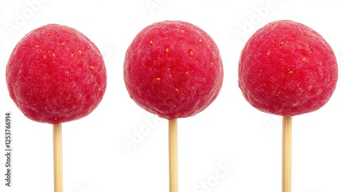 Three Vibrant Red Lollipops Glimmering with Sugar on Sticks Against a White Background