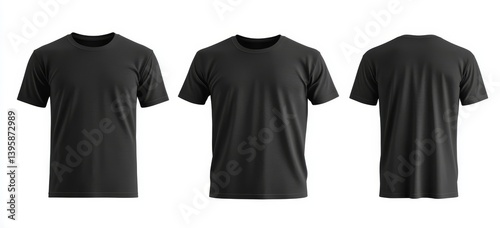 Three views of a black t-shirt, front, side, and back, isolated on white background.