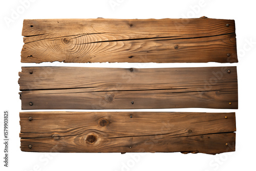 Three weathered wooden planks with visible grain texture and metal fasteners isolated on white background