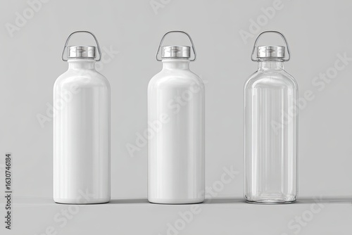 Three white and clear water bottles, side-by-side on a neutral background. Metal handles on each