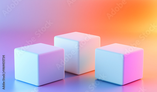 Three white cubes displayed on a gradient background of warm yellow and cool blue lighting.
