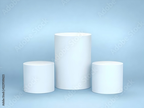 Three White Cylinder Podiums Stand on a Light Blue Background for Product Placement