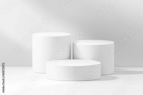 Three white cylindrical pedestals arranged on a white surface isolated on a transparent background cylinder