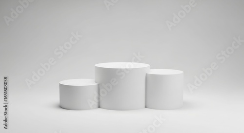 Three white cylindrical podiums arranged in a stack, studio shot, minimalist presentation.